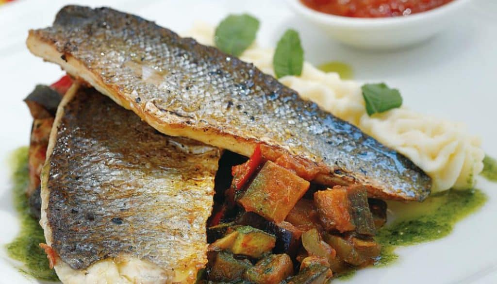Φιλέτο λαβράκι µε ψητά λαχανικά σπιτικό πέστο και σάλτσα από καυτερή πιπεριά