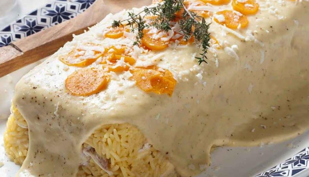 Σε φόρμα, στρώνουμε εναλλάξ πιλάφι, κοτόπουλο και σάλτσα.